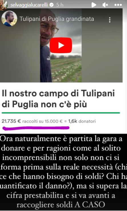 Il video di Giuseppe Savino, imprenditore agricolo pugliese, che piangeva sotto la grandine nel suo campo di tulipani, ieri è diventato virale. E gli attestati di solidarietà e di sostegno, anche economico, non stanno stentando ad arrivare. Selvaggia Lucarelli però muove, sulle stories del suo profilo Instagram, delle osservazioni critiche nei confronti di Savino, titolare dell'omonima cascina in cui si producono anche zucche e altri prodotti, che non sarebbe nuovo ad iniziative social di questo tipo finalizzate poi a raccolte fondi.