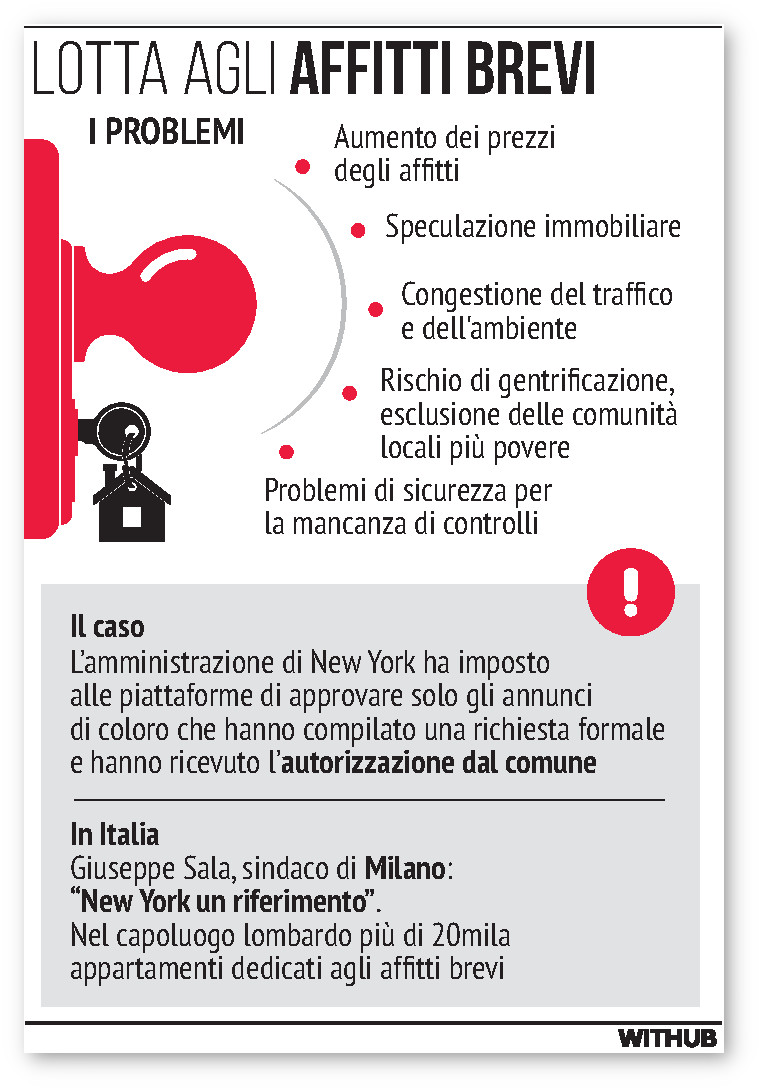 «Continuiamo a ritenere e a ribadire - dice il presidente di Federalberghi Bernabò Bocca - che chi acquista due appartamenti e li può affittare nei week end (perché il limite delle due notti consente di farlo nel fine settimana) non sta facendo un’integrazione del reddito familiare ma una vera attività commerciale, che deve essere tassata come quella di tutti gli altri imprenditori. Troviamo che la norma di New York sia la cosa migliore. È possibile fare affitti brevi solo se l’host vive nello stesso appartmento».