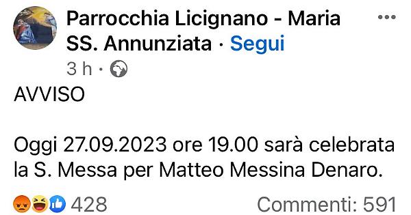 Aveva deciso di celebrare una messa in suffragio del boss Matteo Messina Denaro, ma poi ci ripensa e l'annulla per «prudenza pastorale». È quanto accaduto a Casalnuovo di Napoli, dove il parroco della chiesa «Maria santissima Annunziata», don Tommaso Izzo, stamattina ha pubblicizzato sul profilo facebook della parrocchia, la celebrazione della Santa Messa in suffragio dello scomparso boss, suscitando indignazione tra i fedeli che si sono rivolti al deputato Francesco Emilio Borrelli per segnalare l’insolita decisione.