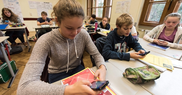 epa05556713 A picture made available on 26 September 2016 shows Students work with smartphones during class in the Friedrich Gymnasium in Freiburg, Germany, 23 September 2016. On 25 September 2016 the project won a 'German Teacher's Award 2016' for innovative lessons in Berlin. Students work out solutions with a smartphone. Scientists are checking whether the project works. It has the character of a federal pilot project. EPA/PATRICK SEEGER