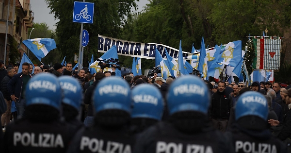 A poche decine di metri sotto le lapidi dei caduti per la resistenza la Brigata ebraica che grida "Israel, Israel", cantando l’inno d’Italia. «Terroristi» e «assassini» è il grido partito dal corteo della Brigata ebraica verso il presidio dei movimenti palestinesi.