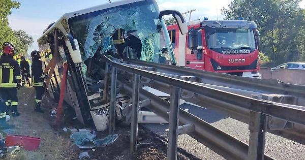 Si rovescia pullman di turisti sull'A1 e si incastra nel guard rail: un morto e 25 feriti