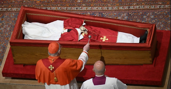 In serata la chiusura della bara: un rito antico, solenne e pieno di significati, con l'apposizione del bianco velo di seta sul viso e l’inserimento della borsa con le monete del pontificato e il tubo con il rogito. Gesti antichi, uguali da secoli, ma che conservano tutto il loro significato; suggellano la fine materiale di un pontificato del quale resta però l’eredità spirituale.