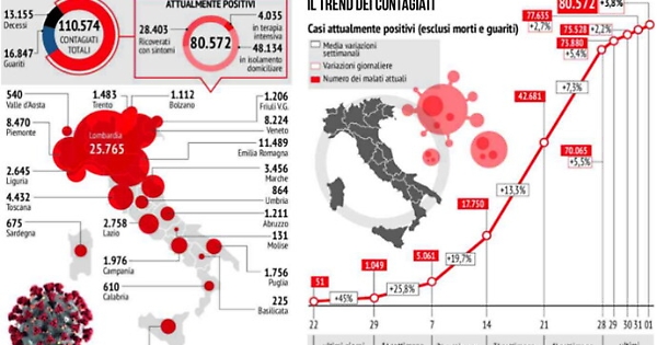 «I segnali di un miglioramento ci sono, ma non sono uguali in tutte le regioni», ha detto ancora Ricci Tersenghi. In alcune realtà, come la Calabria e la Sicilia si registra infatti ancora una velocità di crescita dei casi superiore rispetto a quella delle altre regioni». In generale è comunque possibile dire che «la velocità di crescita si è ridotta, ma che stiamo ancora crescendo. Non sta passando, ma la situazione va migliorando. Per cominciare a vedere dei segnali di riduzione in tutte le regioni bisognerà aspettare ancora 5-7 giorni».