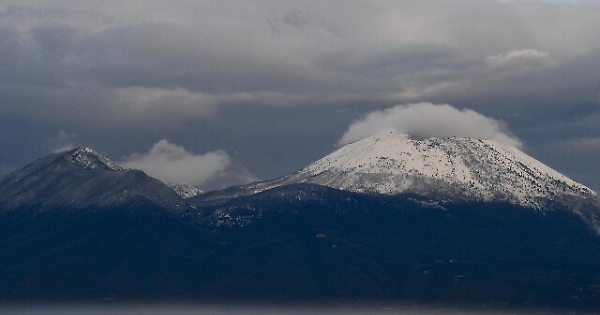 ERCOLANO (NAPOLI), 22 MAR - Vesuvio ricoperto di neve dalla cima alle quote più basse: così si presenta il vulcano più famoso al mondo agli abitanti dei comuni vesuviani e di Napoli. Le piogge delle scorse ore e le temperature più fredde che ancora persistono sulla Campania hanno determinato il formarsi di uno strato nevoso fino alle pendici. (ANSA)