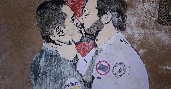 ROMA, 23 MAR - Due murales, uno con l'immagine di Luigi di Maio e Matteo Salvini che si baciano con dietro un cuore rosso, e un altro che ritrae Giorgia Meloni con in braccio un bimbo africano, sono spuntati vicino al Senato, al centro di Roma. Ci sarebbe anche la tag Tvboy, firma di un artista di strada italiano. Sul posto i carabinieri. Da ieri sera è scattato il piano sicurezza per l'insediamento delle Camere con controlli accurati e una 'green zone' nel centro di Roma dove non sono consentire manifestazioni