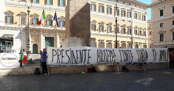 ROMA, 20 AUG - Un lungo striscione con scritto 'Presidente Giuseppe Conte Italia ti ama' è stato affisso nella piazza davanti Montecitorio. A fianco, è stata appesa una bandiera del Movimento Cinque Stelle. Nel giorno in cui il premier si presenterà al Senato per comunicazioni sulla crisi di governo, davanti alla Camera alcuni manifestanti gli stanno esprimendo solidarietà, indossando magliette del Movimento e scandendo slogan da un altoparlante. Oltre allo striscione, c'è un cartellone con la scritta 'Siamo tutti Conte' incorniciata da cinque stelle gialle.