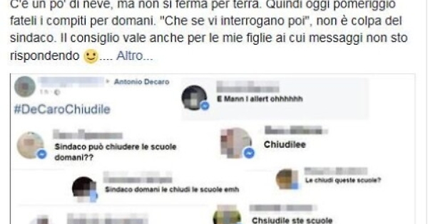 BARI, 26 FEB - "Cari studenti baresi, io vi voglio bene, ma non iniziate con i messaggi strappa lacrime per far chiudere le scuole, perchè per ora, sulla città di Bari non c'è alcuna emergenza meteo". Lo scrive su Facebook il sindaco di Bari e presidente nazionale dell'Anci, Antonio Decaro. "C'è un pò di neve, ma non si ferma per terra. Quindi oggi pomeriggio - aggiunge - fateli i compiti per domani.'Che se vi interrogano poi', non è colpa del sindaco. Il consiglio vale anche per le mie figlie ai cui messaggi non sto rispondendo. Se poi dovesse nevicare...", conclude Decaro che posta anche una parte dei messaggi ricevuti dai ragazzi in cui si 'prega' il sindaco di chiudere le scuole.