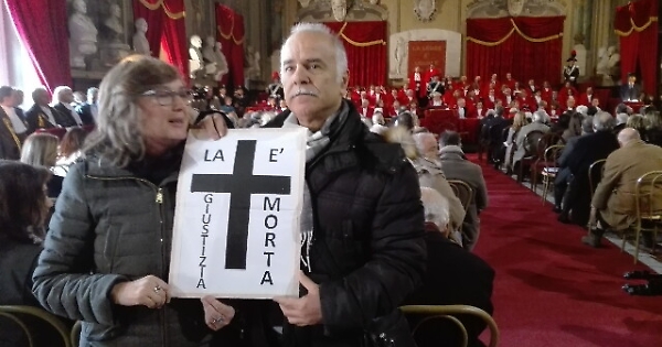NAPOLI, 28 GEN - Protesta del personale amministrativo del Tribunale durante la cerimonia di inaugurazione dell'anno giudiziario a Napoli. Due persone, durante il discorso del rappresentante del Ministero della Giustizia, si sono alzati e, di spalle, hanno mostrato un cartello con la scritta "La giustizia è morta". "La nostra professionalità è stata svenduta - lamentano - abbiamo una laurea e ci ritroviamo a lavorare con gente non qualificata".