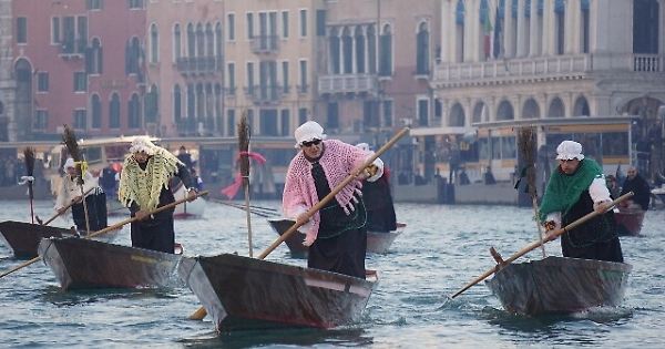 (ANSA)- VENEZIA, 6 GEN - Ampie gonne, scialli di lana, cuffiette colorate e l'immancabile scopa per le 5 'maranteghe' (befane ndr) che in Canal Grande a Venezia hanno disputato la Regata delle Befane, manifestazione su mascarete organizzata dalla Reale Società Canottieri Bucintoro. Ha vinto Francesco Guerra, davanti a Sandro Inchiostro, terzo Roberto Palmarin, quarto Francesco Casellati e quinto Marco Dolcetti. La regata, come da tradizione, ha visto fronteggiarsi 5 soci over 50, ognuno sulla sua "mascareta coa scoa", vestiti da befana. L'appuntamento è nato nel 1978 dalla fantasia di due storici soci della Bucintoro, Nino Bianchetto ed Enzo Rinaldo, che per dimostrare la loro abilità nella voga si sfidarono in una competizione di velocità in Canal Grande il giorno dell'Epifania. Il corteo delle barche sociali ha accompagnato le befane finaliste sul campo di regata e ha trasportato la calza gigante, simbolo dell'evento, poi appesa al Ponte di Rialto.