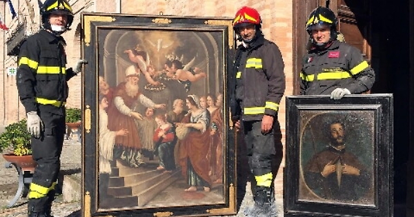 CALDAROLA (MACERATA), 14 NOV - "Questa è la ferita più grande, il dolore più profondo, dopo l'ansia per i miei cittadini: spero che i nostri quadri tornino qui tutti, nel loro splendore". Il sindaco di Caldarola Luca Giuseppetti è riuscito a far mettere in salvo dalla 'zona rossa' del centro storico devastato dal sisma le principali opere d'arte, comprese quelle conservate nella Chiesa Collegiata di San Martino. I vigili del fuoco hanno impiegato ore per rimuovere il grande quadro di Andrea e Simone De Magistris, il pittore cinquecentesco nato qui e riscoperto anche grazie ad una grande mostra organizzata nel 2007 da Vittorio Sgarbi. Le opere ora sono in un luogo sicuro, ma i problemi restano tanti: a cominciare dalla situazione della Torre del Cassero, danneggiata dal sisma del 24 agosto scorso. Con la scossa del 30 ottobre ha subito una pericolosa torsione, e dovrà essere sottoposta a un intervento di consolidamento complesso. In pericolo anche il monumento più famoso di Caldarola, il Castello Pallotta.