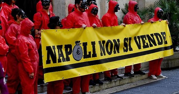 NAPOLI, 12 MAG - Si sono ispirati alla serie "La casa di carta" gli attivisti che oggi hanno protestato davanti alla sede della Banca d'Italia a Napoli per denunciare "il ricatto al quale sono sottoposte le città soggette al debito provocato anche dalle banche che negli anni hanno prestato denaro a condizioni pessime per una pubblica amministrazione, facendo firmare derivati legati ai tassi di mercato europei senza dare le giuste garanzie di informazioni e valutazione dei rischi". I manifestanti, in tuta arancione come i protagonisti della serie televisiva ma che al posto della maschera di Dalì indossavano quelle di Pulcinella, hanno sostato sotto la sede della Banca d'Italia esponendo uno striscione con la scritta 'Napoli non si vende'. La manifestazione si è svolta in concomitanza con altre iniziative simili previste oggi in Spagna ed in Grecia. Il gruppo in arancione si è poi diretto alla vicina sede del Banco di Napoli dove vi sono stati alcuni momenti di tensione con agenti di Polizia.