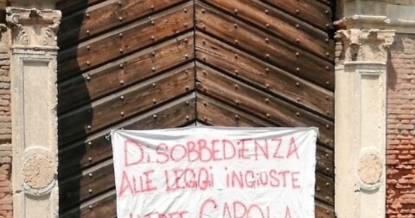 VERONA, 29 GIU - "Disobbedienza alle leggi ingiuste #freeCarola". E' il teso di uno striscione appeso stamane a Verona sul portone di un palazzo del centro storico, in solidarietà con la capitana della Sea Watch, arrestata la notte scorsa dalla Guardia di Finanza per aver violato il divieto di ingresso al porto di Lampedusa. Ieri sera a Verona un centinaio di persone aveva manifestato solidarietà alla nave ancora ormeggiata al largo di Lampedusa, con un sit-in sul ponte Pietra, vicino al Teatro Romano.