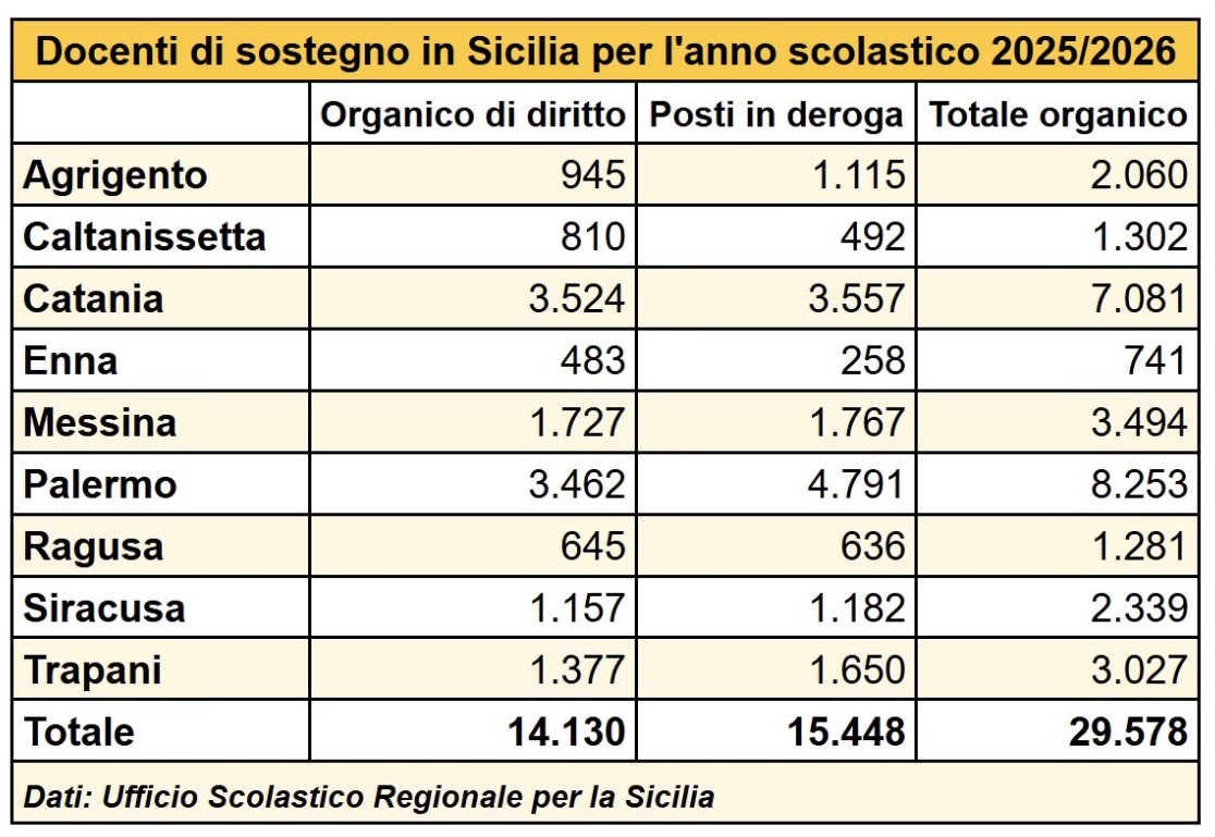 Catania. Per il prossimo anno scolastico 2025-2026 in Sicilia la dotazione organica, elaborata lo scorso maggio dall’Ufficio scolastico regionale (Usr) per la Sicilia, prevede 58.334 docenti in posti interi, e 14.130 in posti di sostegno. Solo che questi ultimi sono in realtà più del doppio. Nell’elefantiaco, iperburocraticizzato e quindi complesso mondo della scuola a quello che potrebbe sembrare un numero esaustivo (i “posti di diritto”) basato sui bisogni per le classi nelle nove province, si aggiungono infatti i docenti in deroga, ovvero “posti a completamento, in esecuzione di sentenze del Tribunale amministrativo regionale (Tar), posti deroga riferiti alla sentenza numero 80 del 2010 della Corte Costituzionale e nuove certificazioni”, come si legge nel decreto Usr. Saranno 15.448 i docenti in questa condizione, che portano il totale della distribuzione dei posti per sostegno a 29.578. Ovvero: si sa già da ora che serviranno più del doppio degli insegnati per la didattica personalizzata.