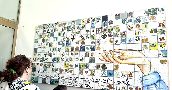 L'opera "Battito d'ali" rappresenta un volo di farfalle e è assemblata con 300 mattonelle decorate a mano dai piccoli artisti