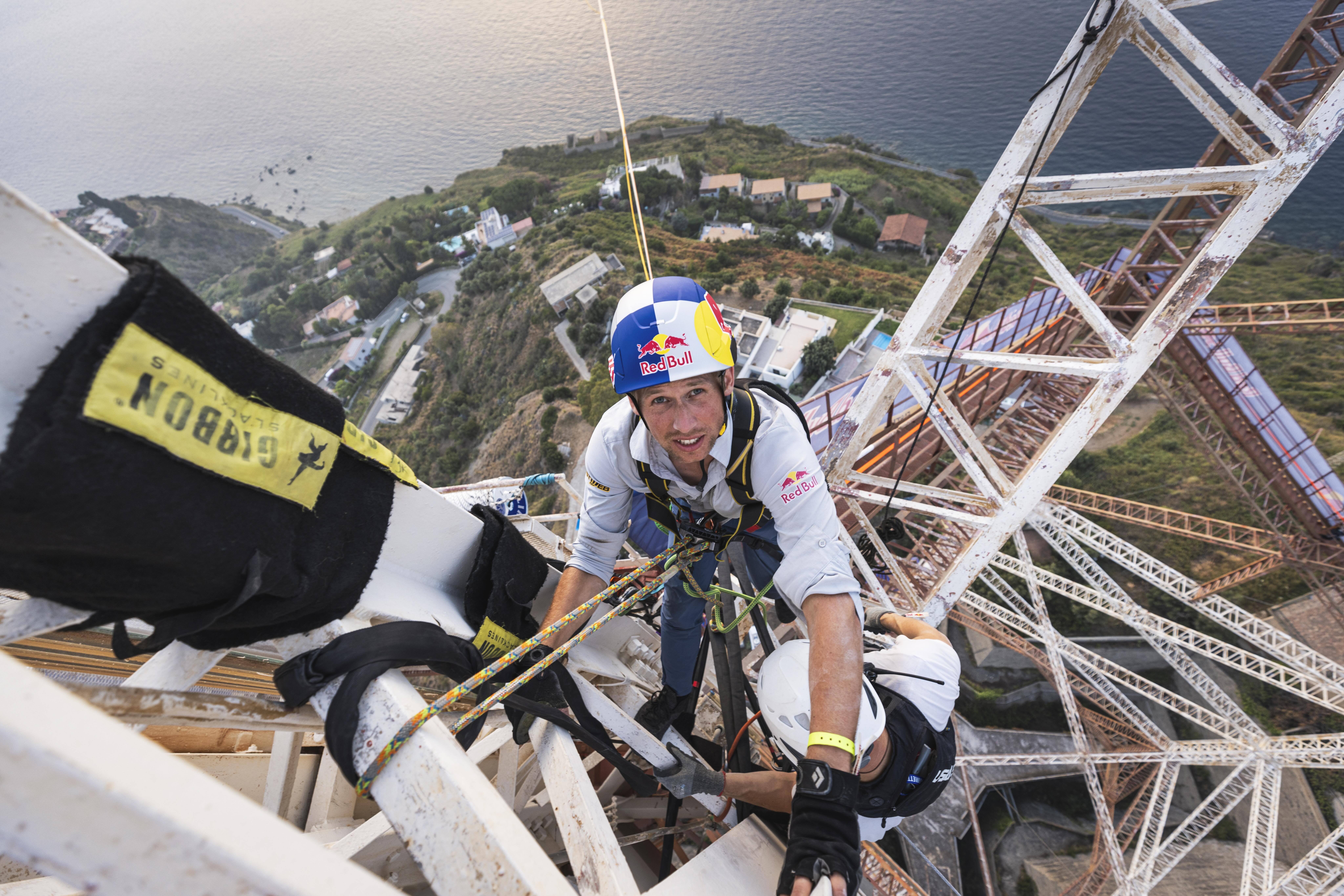 Alle 8,45 il campione estone della Red Bull è partito dal pilone calabrese di Santa Trada e ha già percorso circa 500 metri in 38' di camminata sospeso tra il cielo e il mare
