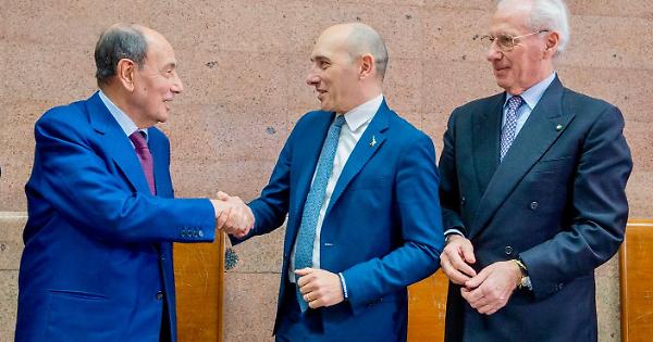 Nella foto il sottosegretario alla presidenza del Consiglio Alessandro Morelli, con il presidente della Regione Renato Schifani e Pietro Ciucci, amministratore delegato della società Stretto di Messina.