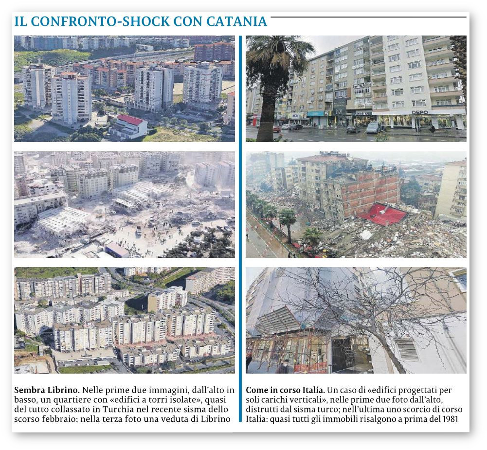 Caliò non nasconde «la corsa, prima di quella data, a depositare i progetti con le vecchie normative, in modo da non tenere conto delle nuove leggi». E così «il 70 per cento del patrimonio residenziale è stato costruito in assenza di norme sismiche», e paradossalmente «i vecchi edifici in muratura sono meno deboli di quelli in cemento armato costruiti negli anni 70». E adesso, nonostante «esistano anche tecniche non invasive, per non costringere i residenti a lasciare la casa durante i lavori», spesso «si preferiscono interventi palliativi che servono solo ad accedere ai bonus, ma non risolvono i problemi strutturali». La responsabilità, oltre che dei politici, è anche dei tecnici, che «non avendo una piena conoscenza non promuovono più di tanto alcuni interventi». Gli stessi che sarebbero inutili in altri contesti. Come quello degli «edifici a torri isolate», con ben poche possibili soluzioni di miglioramento antisismico. Il caso accomuna Librino al “gemello” turco raso al suolo. E dunque bisognerebbe avere «il coraggio di dire le cose come stanno». Ovvero: che bisognerebbe abbattere e ricostruire.