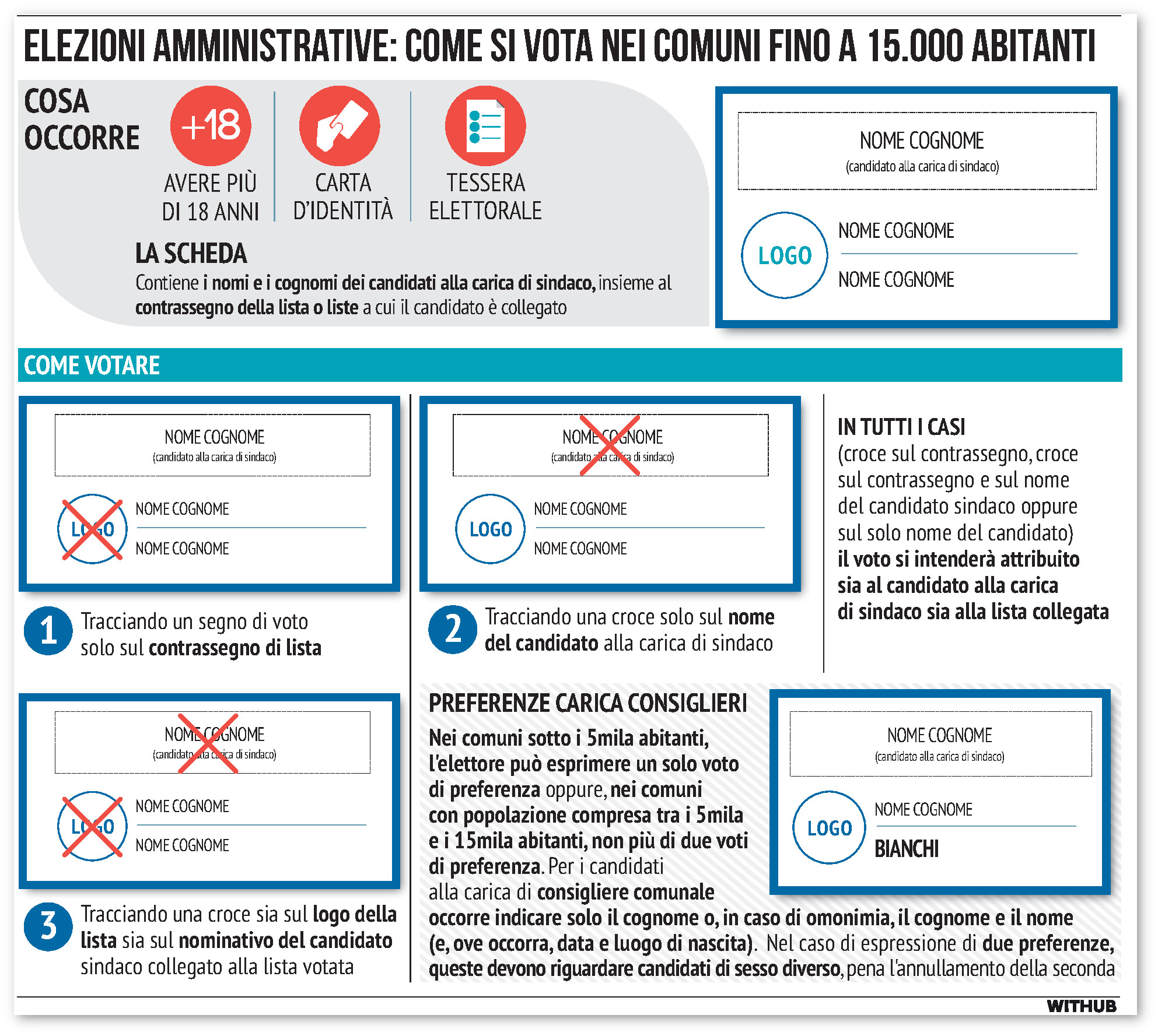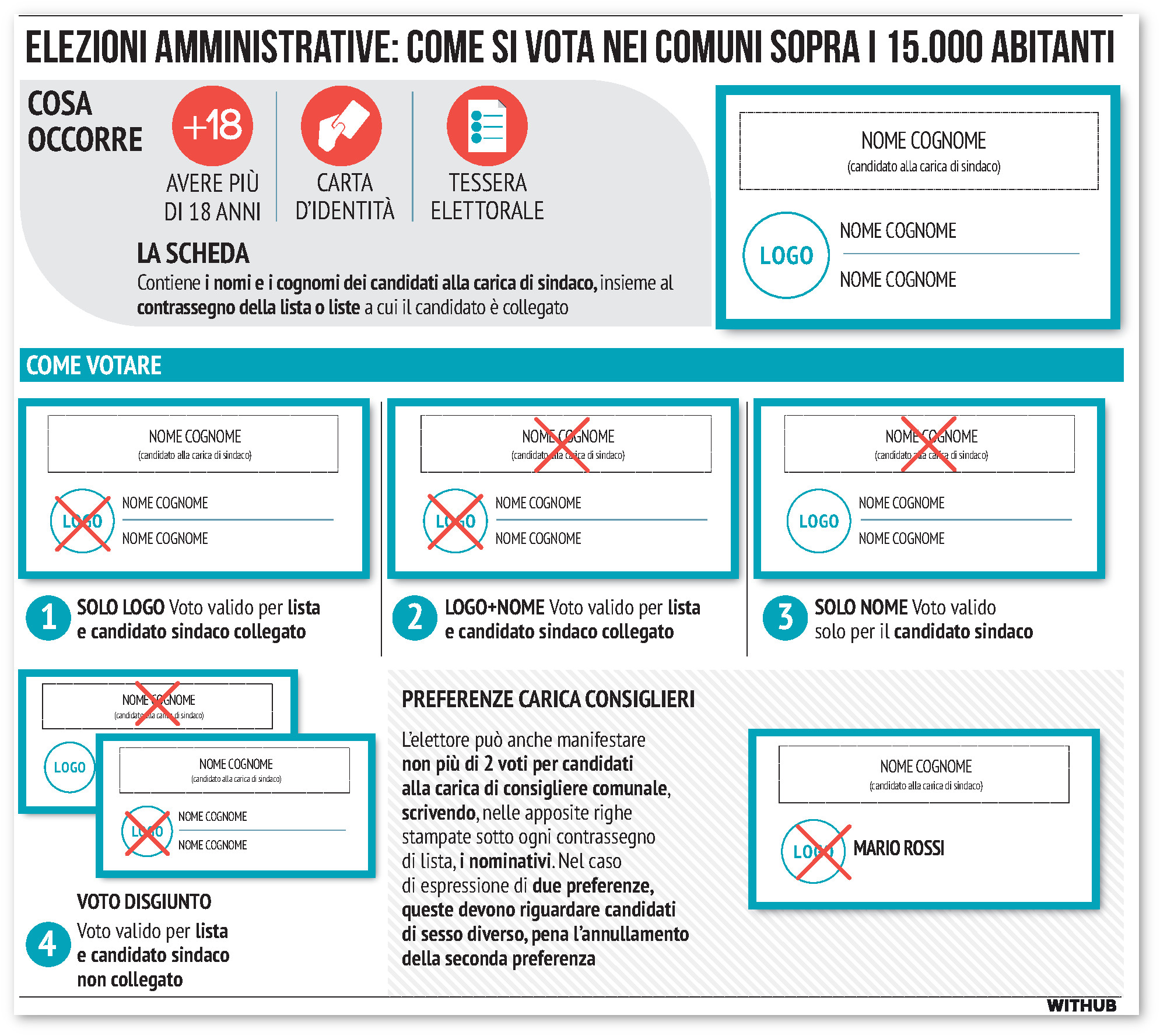 L’elettore - sia per il Consiglio comunale che per quello circoscrizionale - può esprimere una o due preferenze nella stessa lista, ma di genere diverso. Il voto espresso per una lista si estende al candidato sindaco a essa collegato e non viceversa: il cosiddetto «effetto trascinamento». Prevista anche la possibilità del «voto disgiunto», che rende libero l’elettore di votare separatamente per un candidato sindaco e per una lista a questo non collegata.