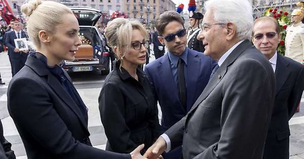 I familiari, gli amici e la compagna di Silvio Berlusconi seguono commossi la cerimonia funebre del Cavaliere. Marta Fascina, che è accompagnata dai genitori seduti nei banchi dietro di lei, ha un completo nero e camicia blu e i capelli raccolti. Accanto a lei Marina, con abito nero e Pier Silvio in completo blu e cravatta grigia. Poi Barbara con giacca e pantaloni neri e un cerchietto nero, Eleonora, in completo nero e che indossa un cappello nero con veletta e Luigi in completo grigio e cravatta nera. Poche file indietro Maria De Filippi con una camicia bianca accanto alla compagna di Pier Silvio, la conduttrice Silvia Toffanin con i figli.