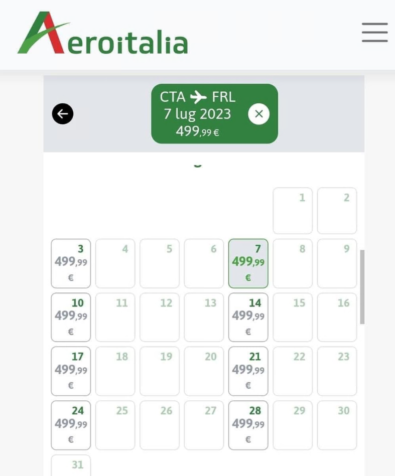 A un certo punto, sul sito di Aeroitalia - la compagnia “assoldata” dal governo regionale per combattere il duopolio Ita-Ryanair alleviando il gravame del caro voli per i siciliani - un Catania-Forlì è arrivato a costare 499,99 euro. Così è stato per tutti voli di luglio, ogni lunedì e venerdì dal 3 al 28.