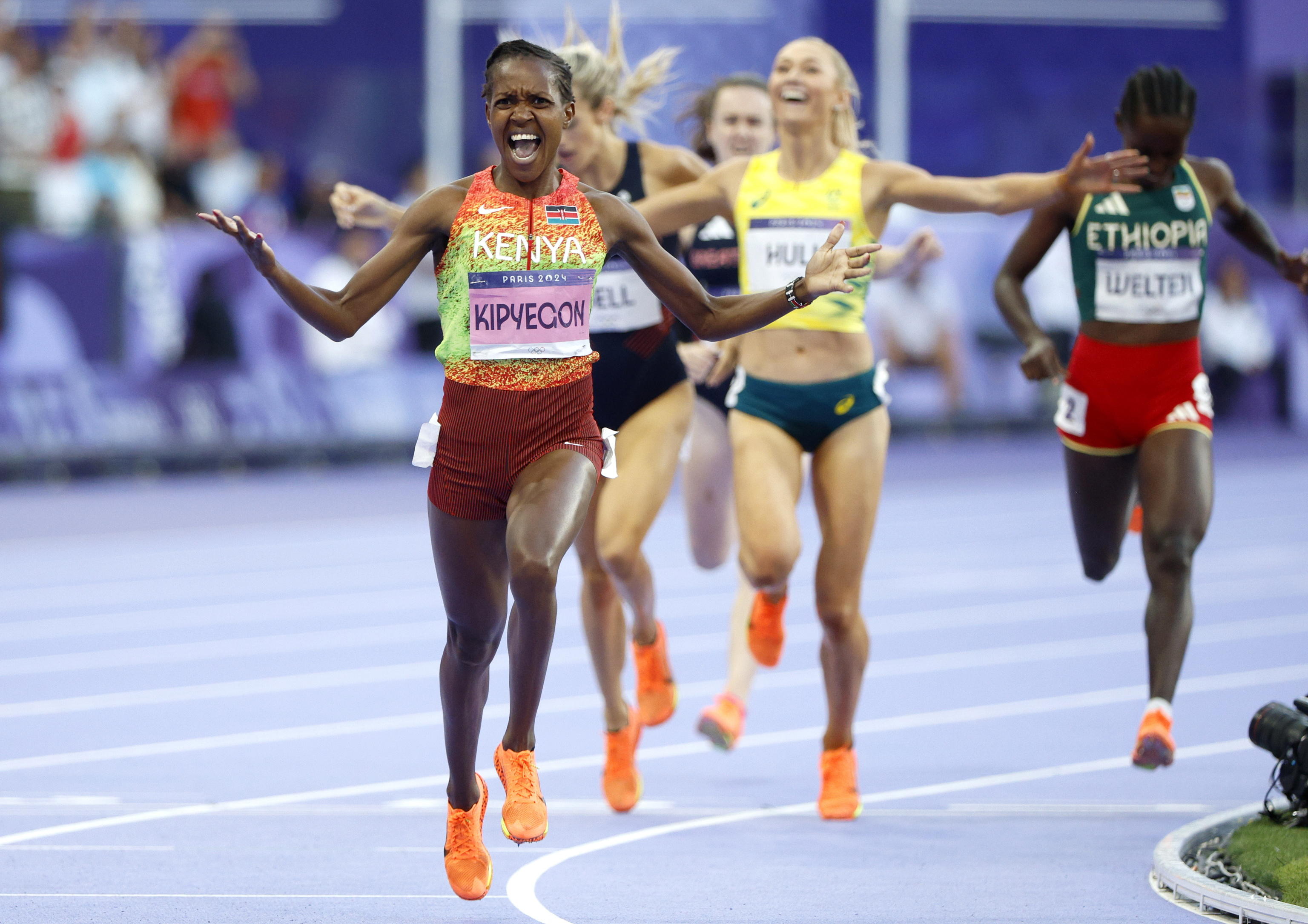 epa11543748 Faith Kipyegon of Kenya celebrates winning the Women 1500m Final of the Athletics competitions in the Paris 2024 Olympic Games, at the Stade de France stadium in Saint Denis, France, 10 August 2024. EPA/CHRISTIAN BRUNA