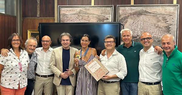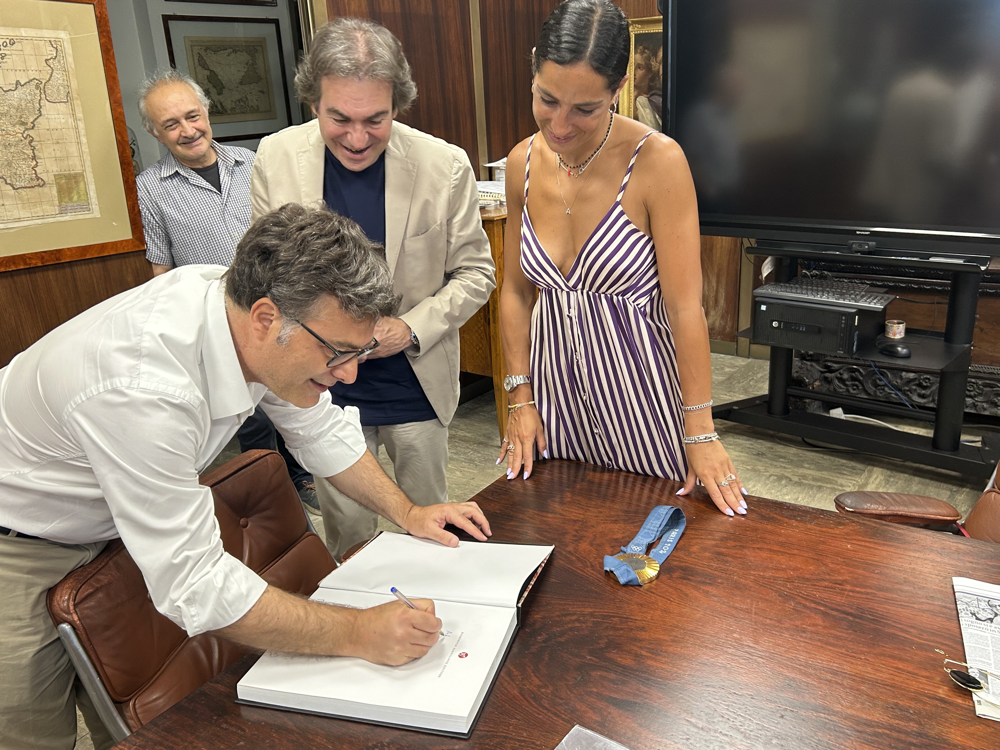 Il condirettore Domenico Ciancio e il direttore Antonello Piraneo i primi a firmare il libro della Dse donato all'olimpionica Alberta Santuccio
