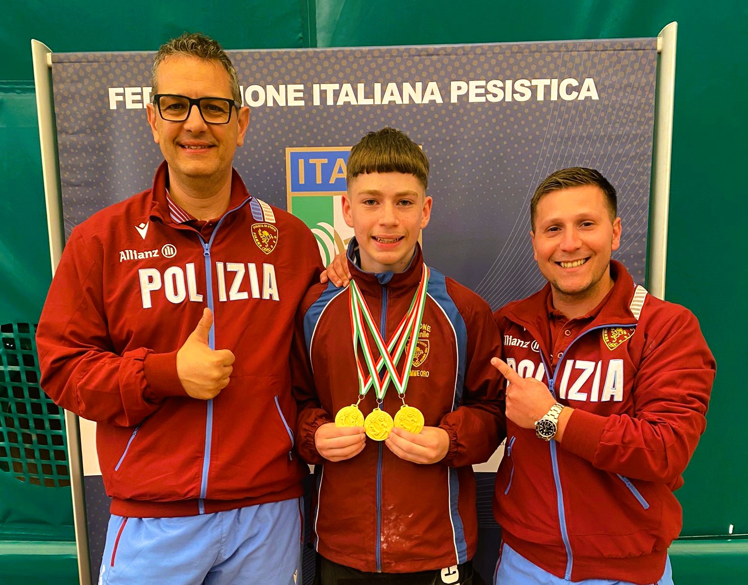 Al centro Mattia Riggi con accanto i maestri Maurizio Sardo e Mirco Scarantino responsabili del Gs Fiamme Oro Caltanissetta di pesisistica