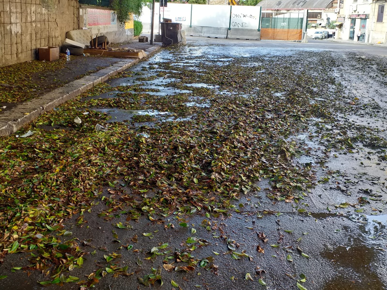 La strada in assenza di spazzamento da parte di chi di competenza é un letto di fogliame che intasano tombini e caditoie. La strada si allaga regolarmente dopo ogni pioggia ed é pericolosissima in quanto estremamente scivolosa.