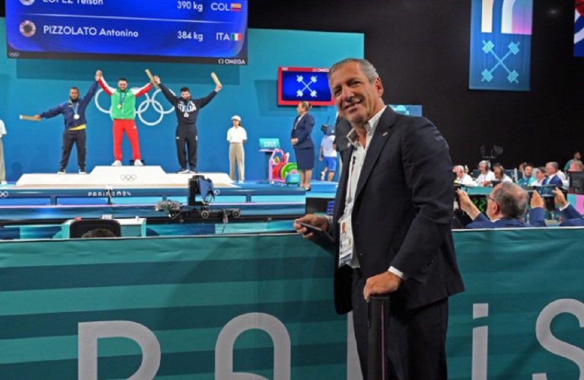 Nino Pizzolato sul podio ai Giochi di Parigi 2024 e il presidente Antonio Urso