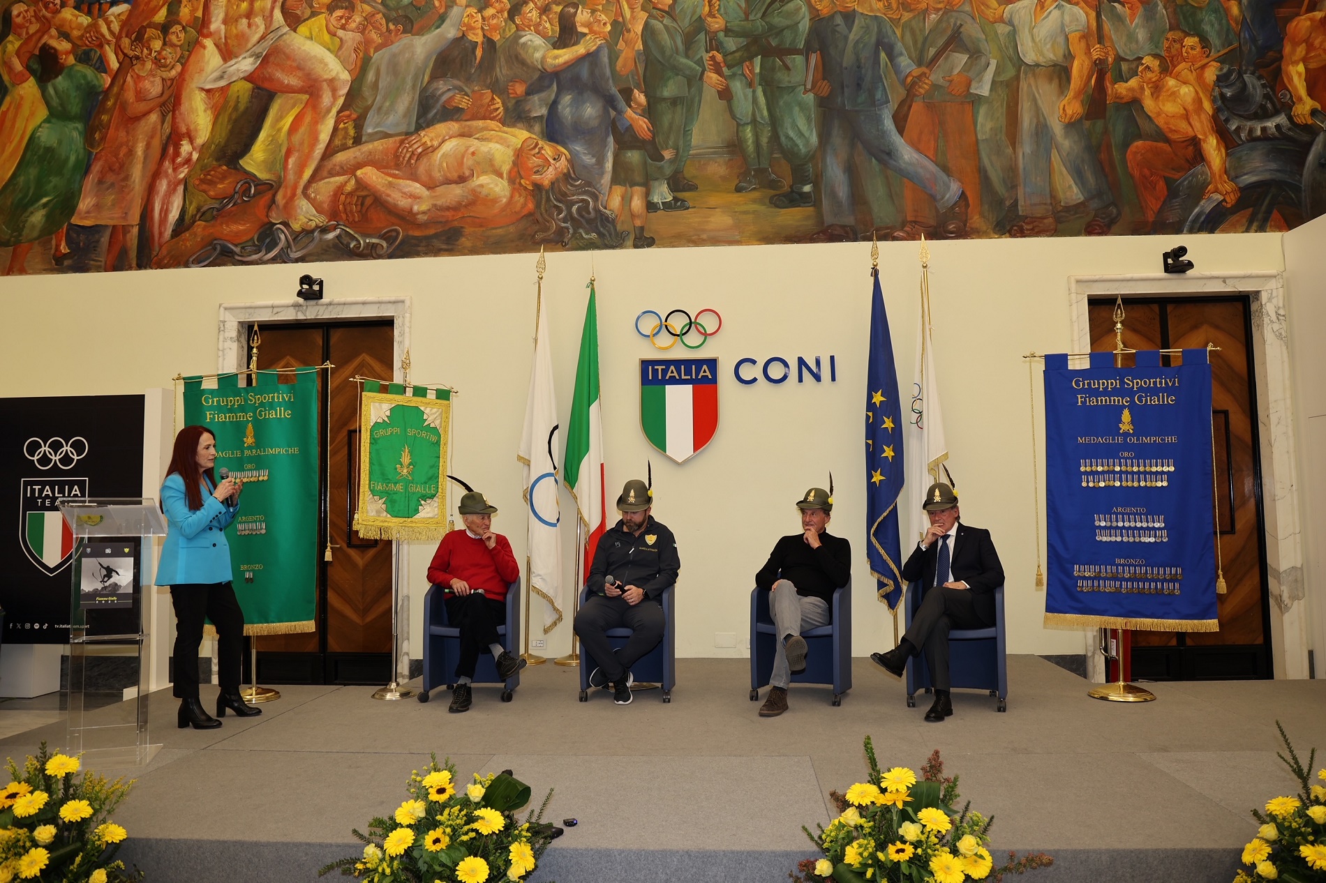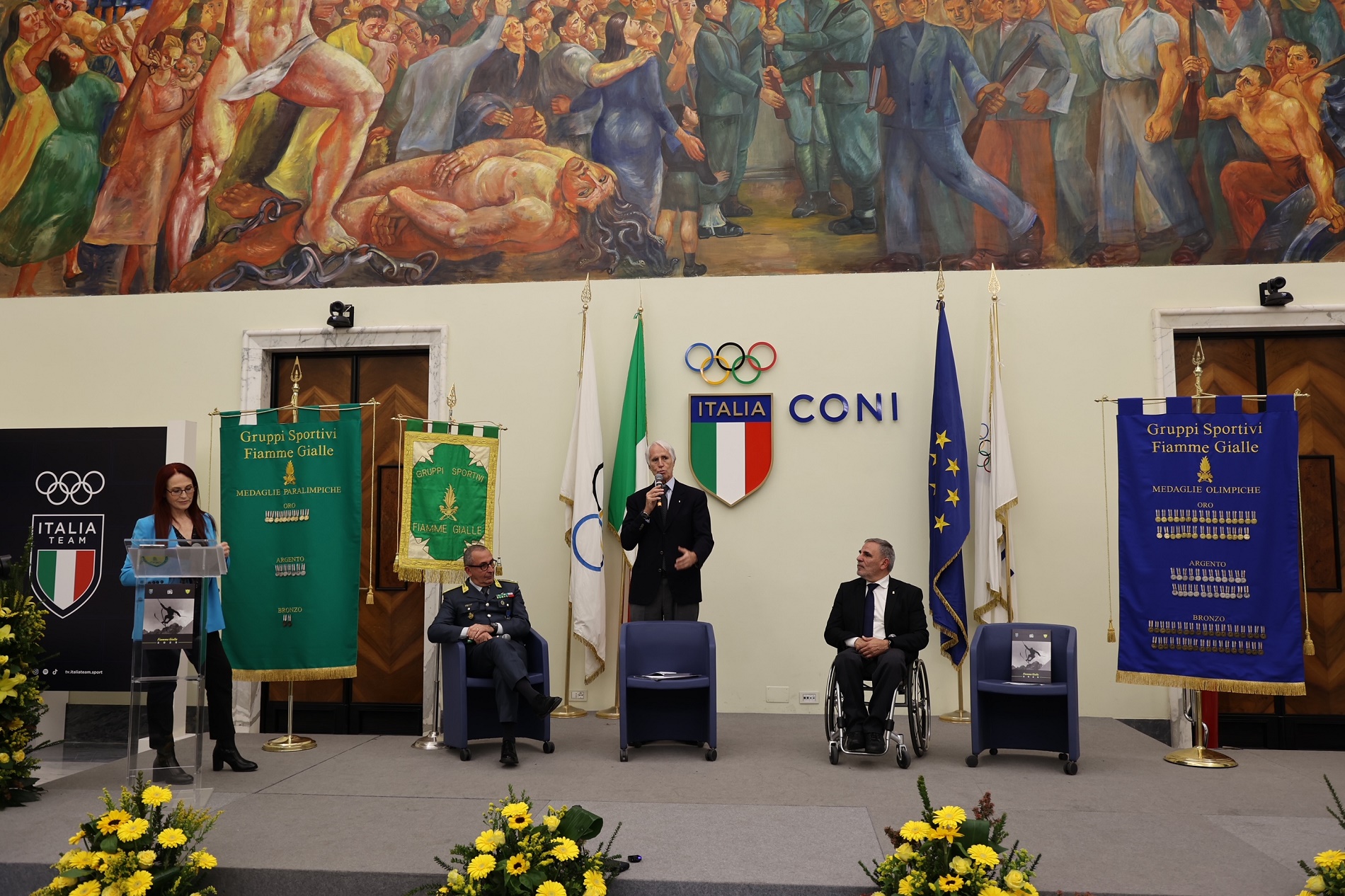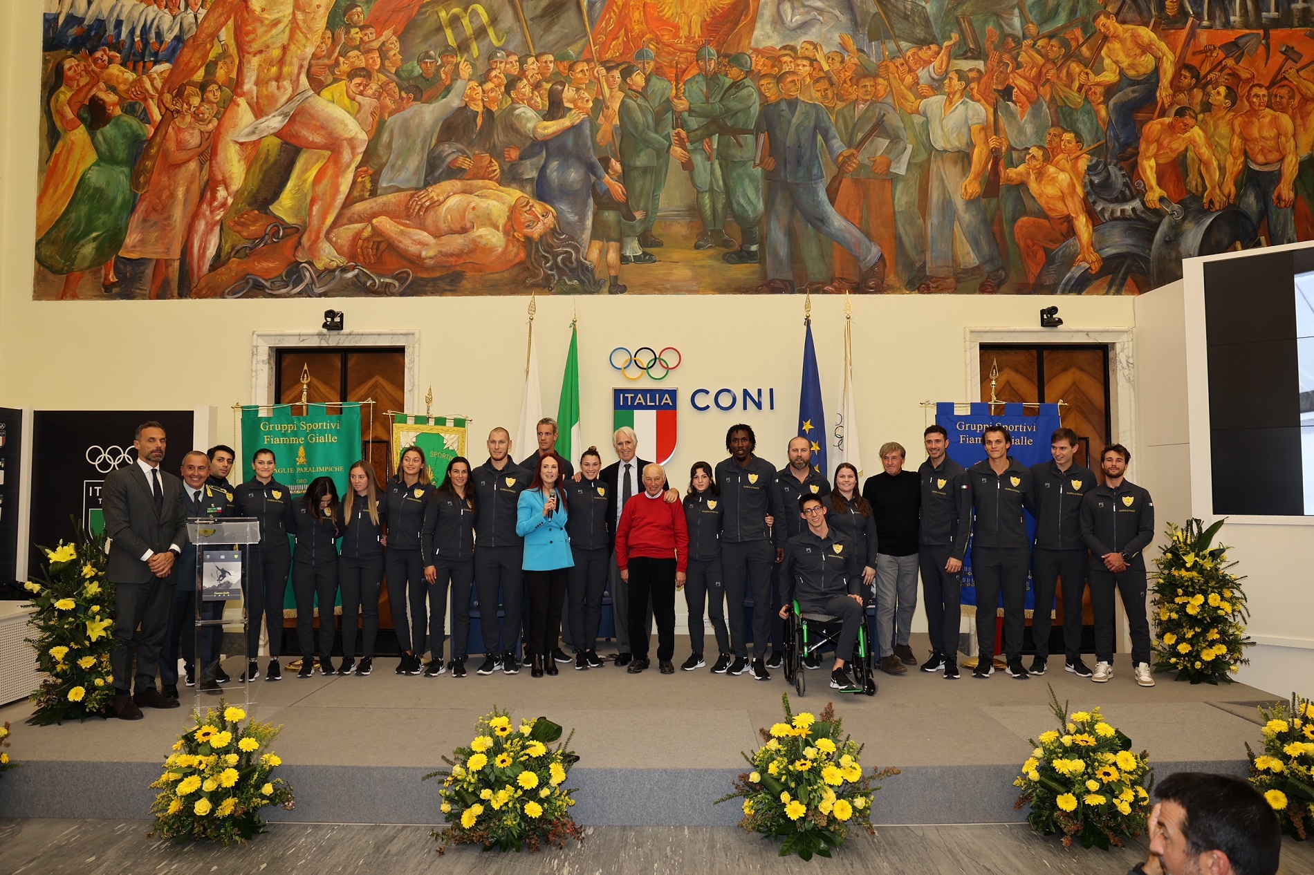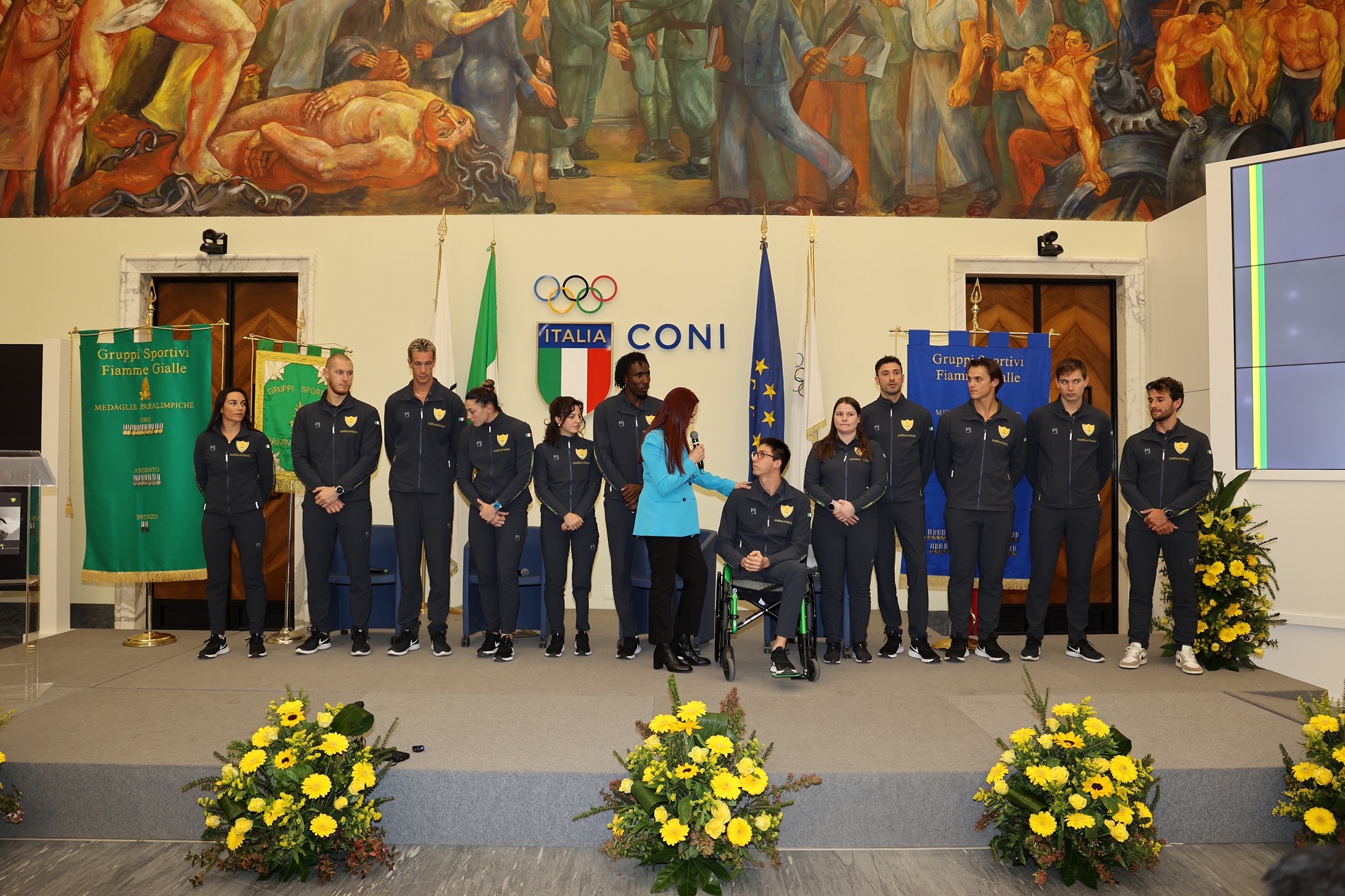 Presenti in sala gli atleti delle Fiamme Gialle: Alice Bellandi (judo), Andy Diaz (atletica), Luigi Samele (scherma), Silvana Maria Stanco (tiro a volo), Elisa Roner e Jacopo Polidori (tiro con l’arco), Giacomo Gentili, Andrea Panizza, Luca Rambaldi e Luca Chiumento (quattro di coppia), Alberto Amodeo (nuoto paralimpico), Ambra Sabatini (portabandiera squadra italiana paralimpica), Ruggero Tita, Marta Maggetti, Sofia Giunchiglia, Giulia Schio e Margherita Porro (vela).