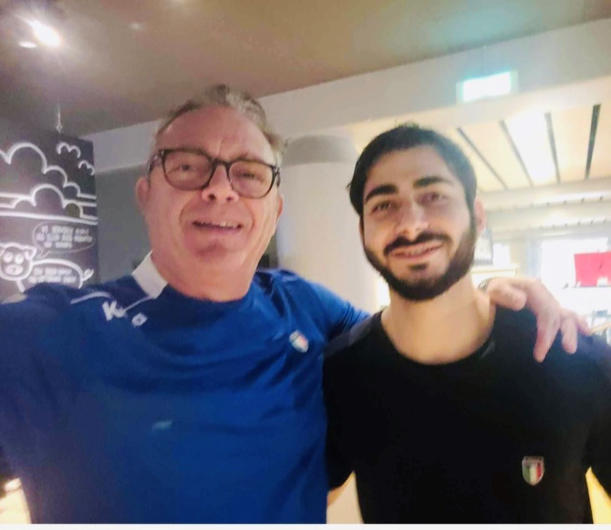 Franco Chionchio, team leader dell'Italia ai Mondiale e l'azzurro Umberto Bronzo, figlio di Corrado, suo compagno di squadra nell'Ortigia Siracusa dei tre scudetti