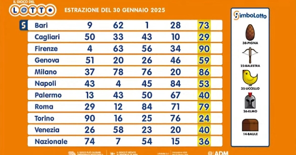Ecco le estrazioni del Lotto di oggi 30 gennaio 2025.