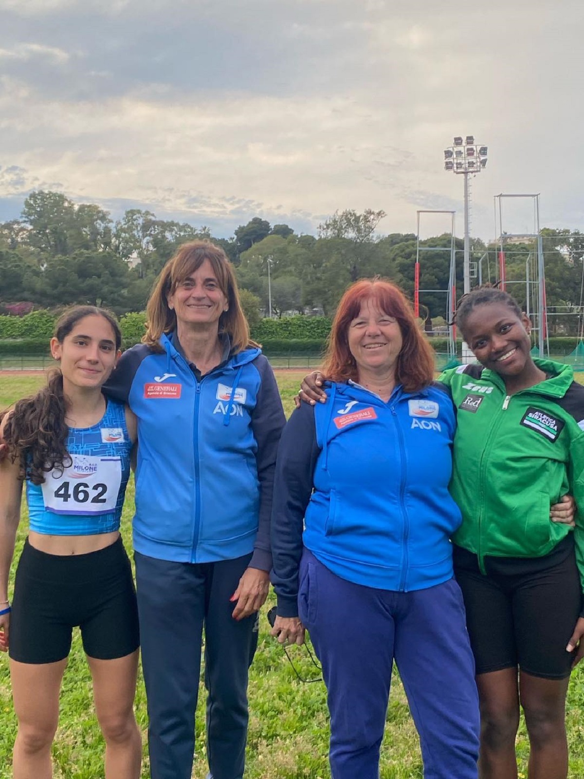 EPTATHLON. Chiara Iacono della Milone Siracusa seguita da due decane dell'atletica siciliana come Luisa Celesia e Luisa Madella ha vinto il titolo allieve col nuovo personale nel lungo (5,53) un buon 16"73 sui 100 ostacoli e il punteggio finale di 3.350 punti grazie anche a 1,26 nell'alto; 6,74 nel peso; 26"80 sui 200; 17,78 nel giavellotto e 3'02"94 sugli 800. Sul podio Marta Licitra allieva alla No al Doping Ragusa di Mauro Guastella, con 3.194 punti; bronzo per Giorgia Mogavero (Running Modica), 2.547 punti e al 4° posto Giulia Nicolini (No al Doping) con 2.324 punti. La gara assoluta ha visto il successo di Haby Kane della Milone Siracusa in prestito annuale all'Atletica Siracusa con il punteggio di 3.462 punti: 17"15 sui 100 ostacoli; 1,44 nell'alto; 5,66 nel peso; 26"05 sui 200; 9,73 nel giavellotto; 2'51"59 sugli 800 e 5,63 nel lungo minimo per i tricolori junior.