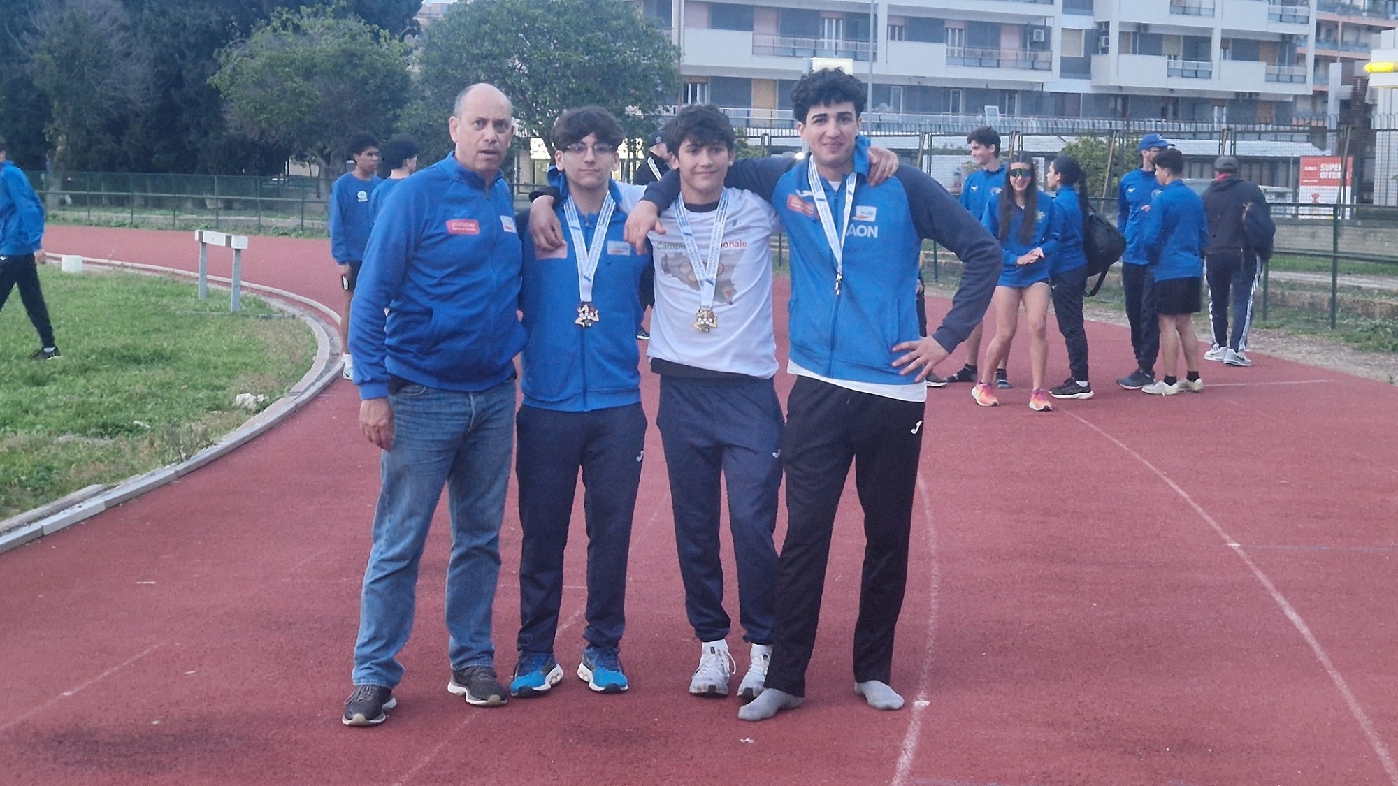 Maurizio Roccasalva presidente della Milone Siracusa con i protagonisti del decathlon allievi: Lorenzo Iacono, Edoardo Alberati e Isidoro Manzella