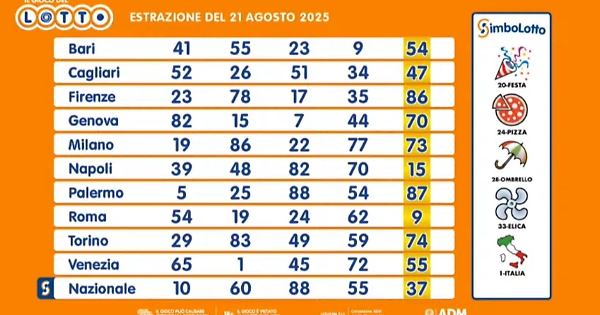Ecco le estrazioni del Lotto di oggi 21 agosto 2025: