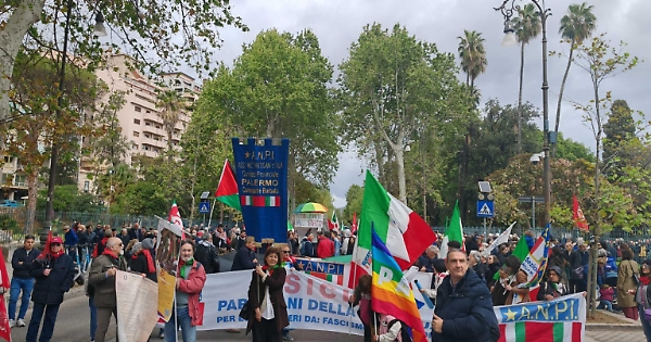 Dopo la celebrazione dell’anniversario della Liberazione al parco Piersanti Mattarella a Palermo è partito sotto una leggera pioggia il corteo aperto dallo striscione «Partigiani della costituzione, liberi da fascismo, mafia e corruzione». I manifestanti prima di iniziare a sfilare hanno cantato 'Bella ciaò. Al corteo molto partecipato con tante bandiere dell’Anpi, della Pace, dei sindacati si sono uniti anche gruppi con bandiere della Palestina e che hanno inneggiato alla libertà per Alfredo Cospito e Ilaria Salis. I manifestanti hanno sfilato in via Della Libertà fino al teatro Massimo.