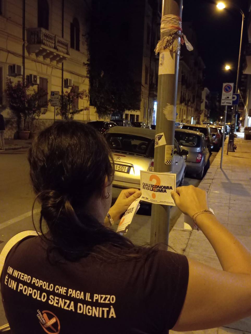 «Nel corso di questi venti anni - si legge nella nota - sono stati innumerevoli i momenti nei quali abbiamo tappezzato in piena notte la città di Palermo. Dal centro storico a Brancaccio, dalla Noce a San Lorenzo passando per Resuttana, Pagliarelli e tante altre aree della città con messaggi e contenuti che volevano stimolare anche una riflessione. A distanza di venti anni, la notte appena trascorsa ci ha visti tornare in strada, per il centro storico di Palermo tra via Maqueda, Corso Vittorio Emanuele, Via Emerico Amari e Via Isidoro La Lumia. Luoghi dove negli ultimi dieci anni si è registrato un cambiamento urbanistico, produttivo e sociale il cui impatto non ha precedenti nella storia di Palermo. Un mutamento da cui si è generata una nuova ed importante economia che ha il proprio perno nella fruizione turistica dei luoghi del centro storico». «Strade dalle quali - spiegano i ragazzi di Addiopizzo - stanotte oltre a rinnovare il messaggio storico desideriamo rivolgere e condividere una domanda, tutt'altro che retorica, con l’opinione pubblica, il tessuto economico e la classe politica di questa città. Senza pretesa di dare risposte ma con la volontà, anche stavolta, di aprire una riflessione. Quale economia per queste strade della città?».