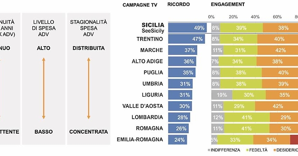 Dalla ricerca di UniCatt si evince poi come per le regioni, tra cui la Sicilia, la pubblicità tv e le produzioni audiovisive (i programmi e i film), generano il 90% di effetti positivi, di cui 1/3 di fedeltà: quei turisti che tornano in vacanza in Sicilia e 2/3 di attrazione di nuovi turisti. La pubblicità televisiva si trasforma così per la Sicilia in un contatto effettivo: un contatto su 2, con il 90% di ricaduta positiva con fedeltà al 35% (turisti che ritornano), 38% al desiderio, turisti che hanno voglia di visitare e il 17% che l’hanno visitata per la prima volta grazie alla pubblicità.