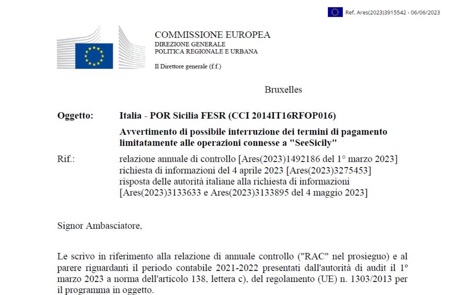 E non è soltanto una figuraccia che riguarda il rapporto Ue-Sicilia. Il destinatario della nota è l’ambasciatore Vincenzo Celeste, rappresentante permanente dell’Italia presso l’Ue. Ma la comunicazione è indirizzata anche ad altri vertici comunitari, all’ispettore generale capo del ministero dell’Economia, all’Agenzia per la coesione e alle Autorità di gestione, certificazione e audit della Regione Siciliana. Il punto di partenza è appunto la Rac (Relazione annuale di controllo) da cui emerge il primo dato sconfortante. Sulle operazioni di “SeeSicily” sono stati effettuati controlli a campione sul periodo contabile 2020/21: su 2.720473 euro imputati alla voce «Pernottamenti» sono state individuate «irregolarità» pari 735.089,25 euro; sulla «Promozione del programma» sarebbero illegittimamente spesi 680.118 euro su 2.813.159 verificati.