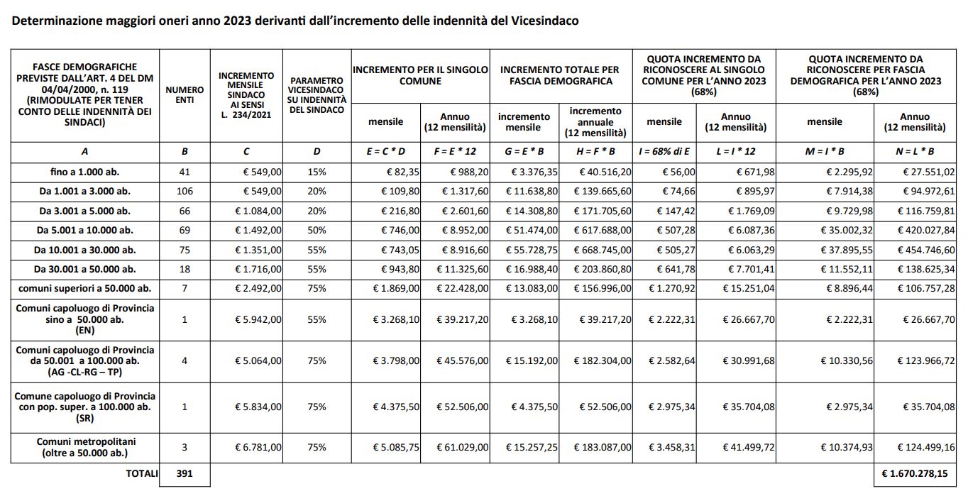 Qui sotto la tabella relativa all'aumento delle indennità per i vicesindaco dei comuni siciliani