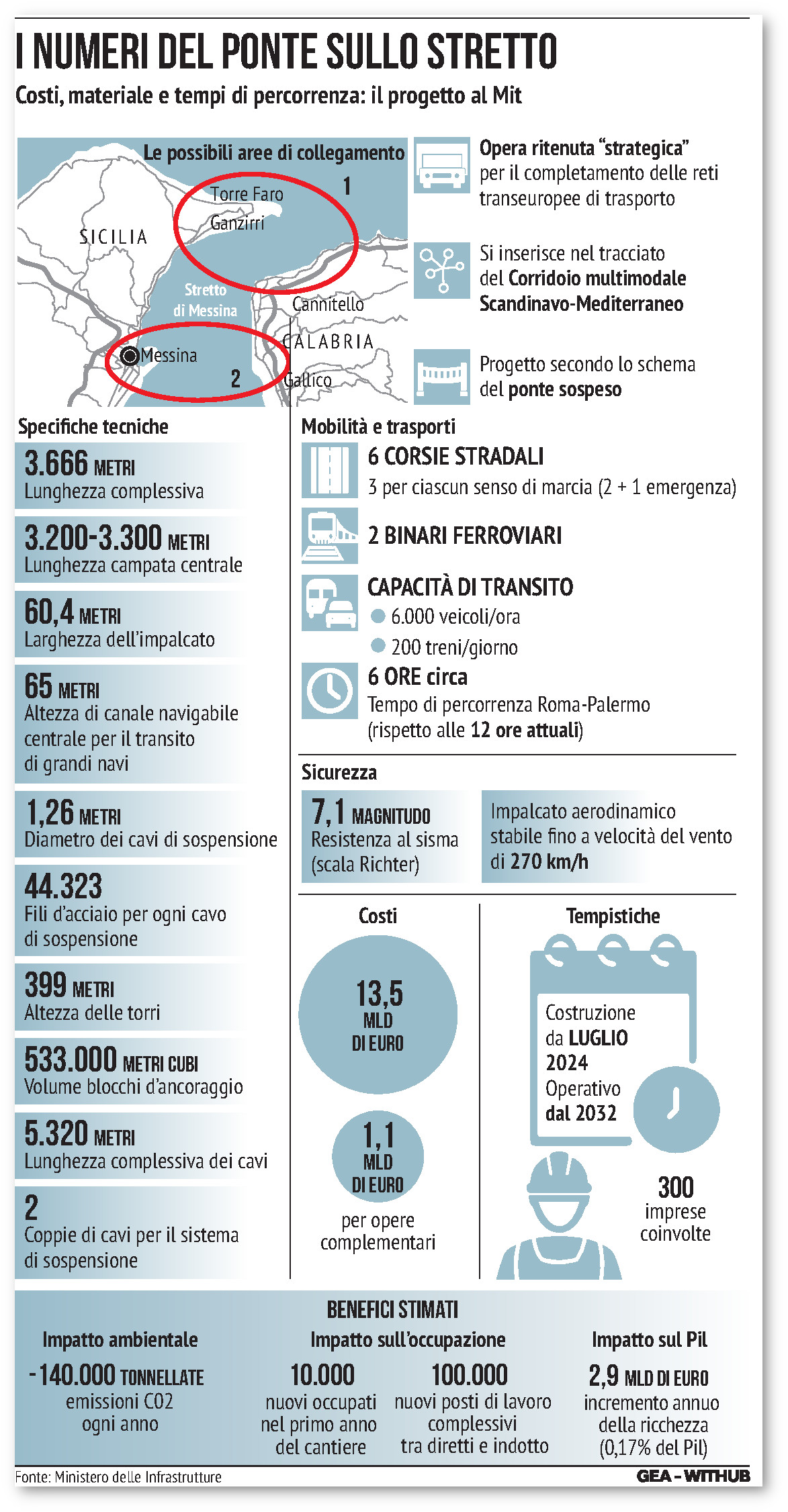 Riordiniamo le idee. E soprattutto le cifre, piuttosto ballerine nelle ultime settimane. La manovra del governo di Giorgia Meloni autorizza, al comma 272 del mega-articolo 1 approvato a Palazzo Madama, la «spesa complessiva» di oltre 9,3 miliardi di euro, ridotta rispetto agli 11,6 inizialmente previsti. La scansione pluriennale: 607 milioni per il 2024; 885 milioni per il 2025; 1,15 miliardi per il 2026; 440 milioni per il 2027; 1,38 miliardi per il 2028; 1,7 miliardi per il 2029; 1,43 miliardi per il 2030; 1,46 miliardi per il 2031; fino ad arrivare a 260 milioni nel 2032. Sono risorse previste «al fine di consentire l’approvazione» del Cipess (il vecchio caro Cipe, che dopo mezzo secolo, sopravvissuto anche a chi, come ad esempio Matteo Renzi, voleva sopprimerlo, ha dato una rinfrescata al nome: dal 2021 si chiama Comitato interministeriale per la programmazione economica e lo sviluppo sostenibile), «entro l’anno 2024», del «progetto di collegamento stabile tra la Sicilia e la Calabria». Il Ponte sullo Stretto, appunto.