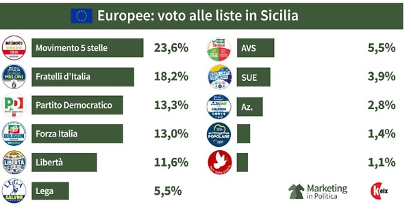 Alle Europee il M5S resta prima forza in Sicilia, FdI sotto il 20%, Forza Italia (13%) tallona il Pd