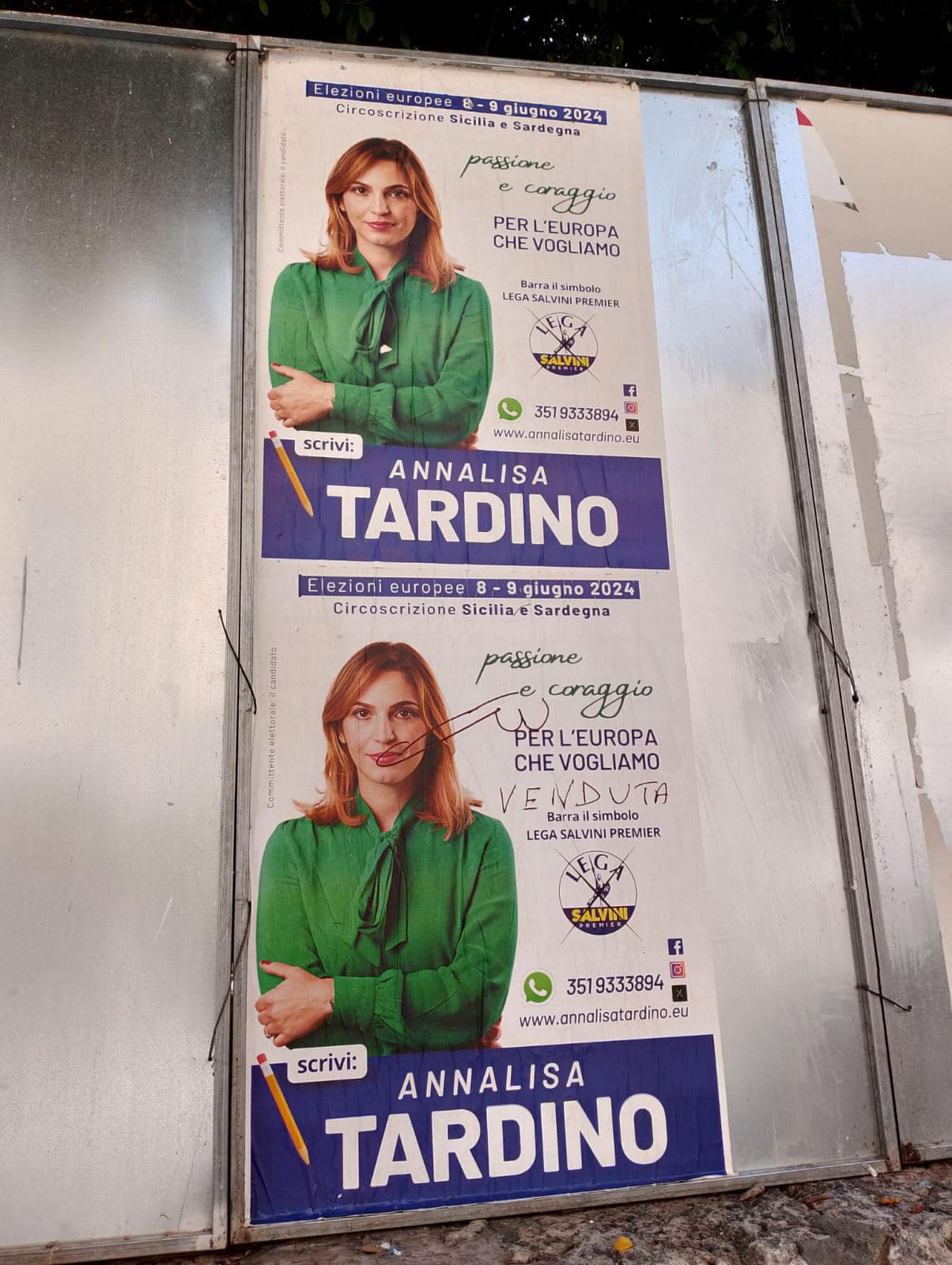 «Ho sporto denuncia contro ignoti perché quanto accaduto sui miei manifesti è un gesto volgare e sessista, antidemocratico, da condannare pubblicamente e che cerca di far degenerare una competizione elettorale che preferirei improntare sul reciproco rispetto e sulla correttezza». Così Annalisa Tardino, europarlamentare e candidata capolista per la Lega Salvini Premier nel collegio isole, dopo che alcuni sconosciuti, per due volte nella notte, hanno ricoperto i suoi manifesti elettorali con disegni volgari e scritte offensive e sessiste. "Non si tratta di una bravata - sostiene Tardino -, poiché pure reiterata, ma dell’ennesimo attacco ai danni della Lega, come sta avvenendo in tutta Italia, da parte di vigliacchi antidemocratici e soprattutto contro una donna. Non vedo manifesti di uomini mai presi di mira con sconcerie. La parità tra uomo e donna, soprattutto in politica, è una conquista che non possiamo far minare da nessuno».