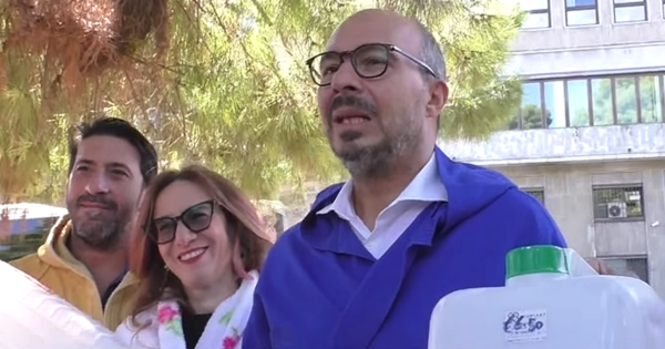 Siccità, Faraone con bidoni e accappatoio si scaglia contro Schifani: «E' incapace»