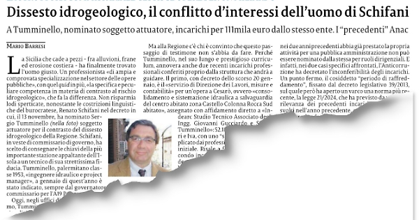 La selezione si chiude il 7 novembre: «Esito negativo». L’11, con il lungo weekend palermitano in mezzo, arriva l’èureka!: nominato un «soggetto esterno» dotato di «specifiche e consolidate competenze in materia di mitigazione del rischio idrogeologico». Cioè Tumminello, indicato a gennaio da Schifani come sub-commissario dell’A19 Palermo-Catania. S’era cercato, invano, per oltre tre mesi; s’è trovato in quattro giorni. Lui, «ingegnere idraulico e project manager», è l’uomo giusto per affiancare il governatore-commissario nel miliardario risanamento dell’Isola che cade a pezzi.
