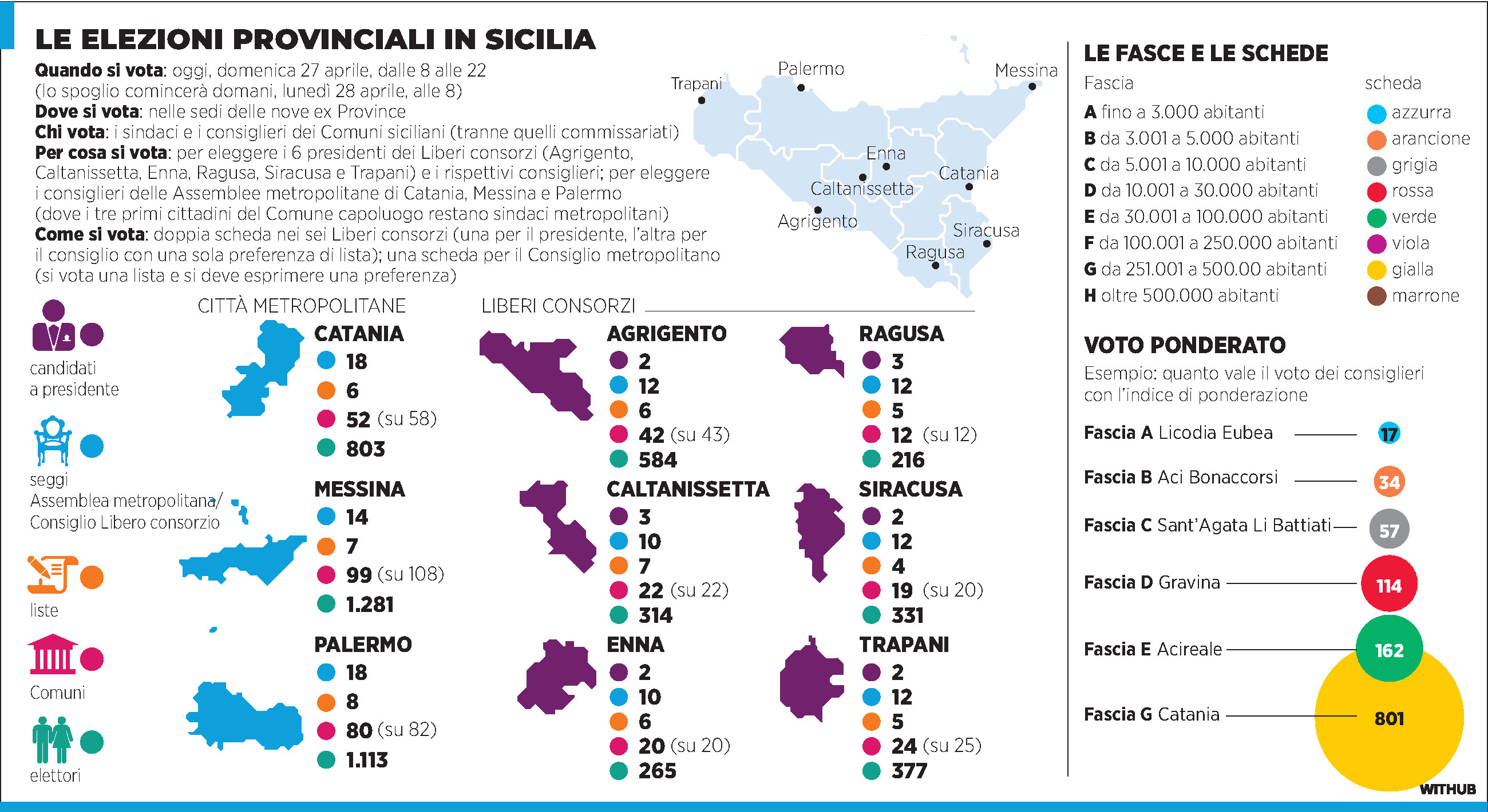 Bentrovati nelle elezioni meno sentite della storia siciliana. Anche perché i cittadini non votano. Oggi, dalle 8 alle 22, saranno i sindaci e i consiglieri comunali a esprimersi sui Consigli delle Città metropolitane (oltre a Catania, anche Messina e Palermo, dove i sindaci dei capoluoghi resteranno anche alla guida dell’ente provinciale), ma soprattutto sui presidenti e sui Consigli dei Liberi Consorzi di Agrigento, Caltanissetta, Enna, Ragusa, Siracusa e Trapani. Sul sito della Regione non ci sono dati centralizzati, ma abbiano calcolato - dopo una lunga e talvolta ardua, navigazione nei nove siti web istituzionali - che oggi la tornata elettorale di secondo livello coinvolge 5.284 rappresentanti (fra sindaci e consiglieri) di 370 comuni siciliani, esclusi quelli attualmente commissariati. I seggi in gioco sono 118, di cui 50 nelle tre Città metropolitane (con 21 liste in campo) e 68 nei sei Liberi consorzi, contesi da 33 liste.