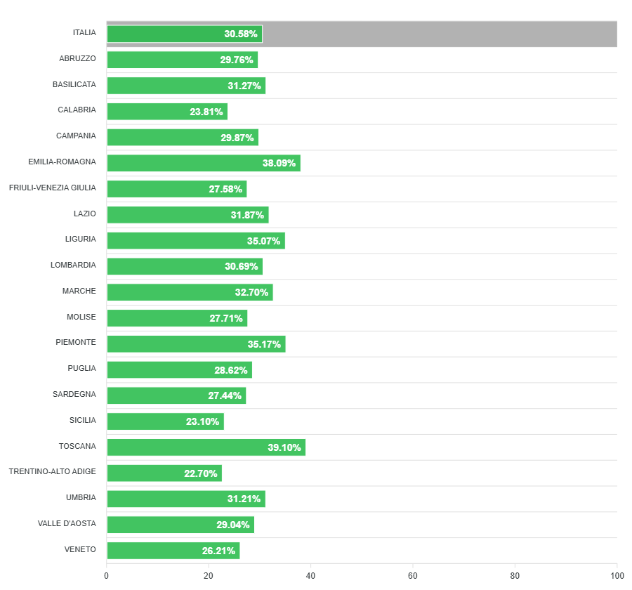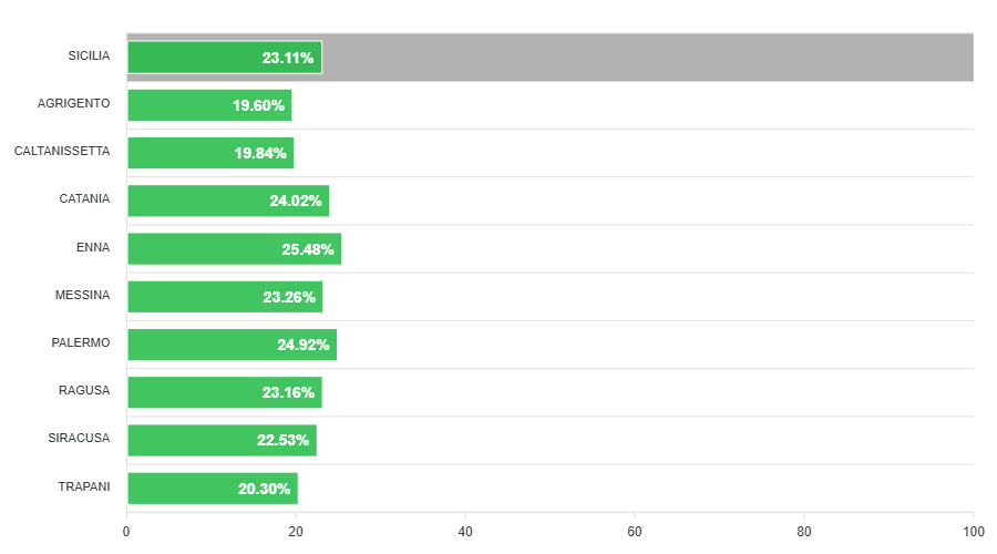 In Sicilia ha votato solo il 23,10% degli aventi diritto al voto. Alle urne è andato poco più di un milione di elettori rispetto agli oltre 4,6 milioni che ne avevano diritto. Ecco il dettaglio nelle province. In Italia il dato dell'affluenza si è fermato al 30,58 e la Sicilia è dunque di oltre sette punti al di sotto del dato nazionale. In Toscana ha votato il 39,1% (ed è la Regione con il dato più alto), mentre il Trentino Alto Adige con il 22,7% è la Regione con il dato dell'affluenza più basso (e la Sicilia è dunque penultima).