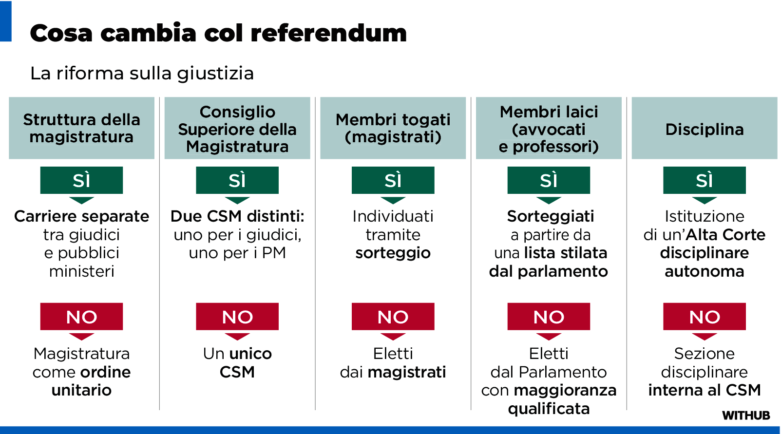 Sulla scheda, l’elettore è chiamato a confermare o respingere la riforma della giustizia promossa dal governo guidato da Giorgia Meloni e dal ministro della Giustizia Carlo Nordio. I tre pilastri sono: la separazione delle carriere tra magistratura giudicante (i giudici) e requirente (i pubblici ministeri); la creazione di due Consigli superiori della magistratura (un Csm per i giudici e un Csm per i pm), entrambi presieduti dal Presidente della Repubblica; l’istituzione di un’Alta Corte disciplinare autonoma per i procedimenti disciplinari sui magistrati.