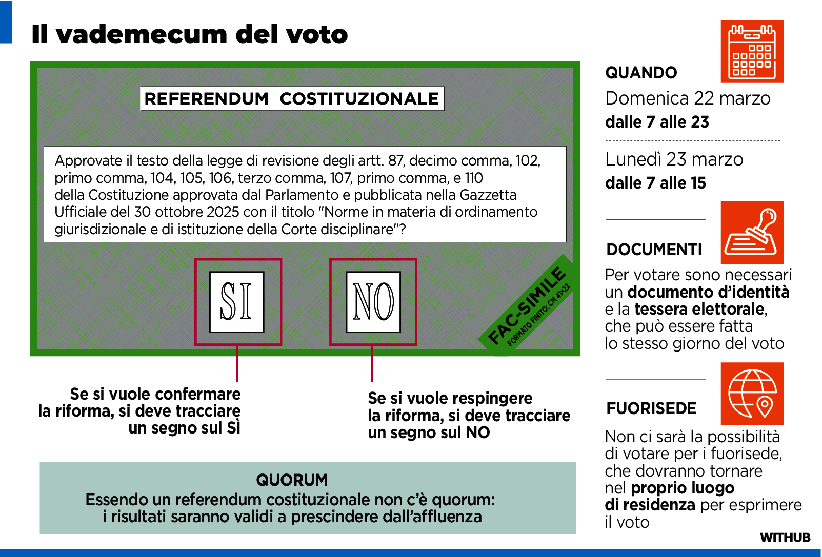 Si vota oggi fino alle 23 e domani dalle 7 alle 15. È un referendum costituzionale confermativo, previsto dall’articolo 138: non prevede quorum, a differenza dei referendum abrogativi. All’estero si vota per corrispondenza. Informazioni e indicazioni operative sono state diffuse nelle scorse settimane da ambasciate e consolati.